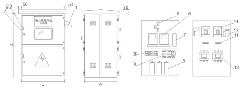 1. Inlet cable through pipe 2, door lock (open lock) 3, door lock rain box 4, door lock (hidden lock) 5, current transformer 6, meter 7, junction box 8, capacitor 9, switching fused contactor 10, small circuit breaker 11, isolation switch 12, zero sequence transformer 13, leakage current circuit breaker 14, outgoing رہC contactor 15, outgoing air switch